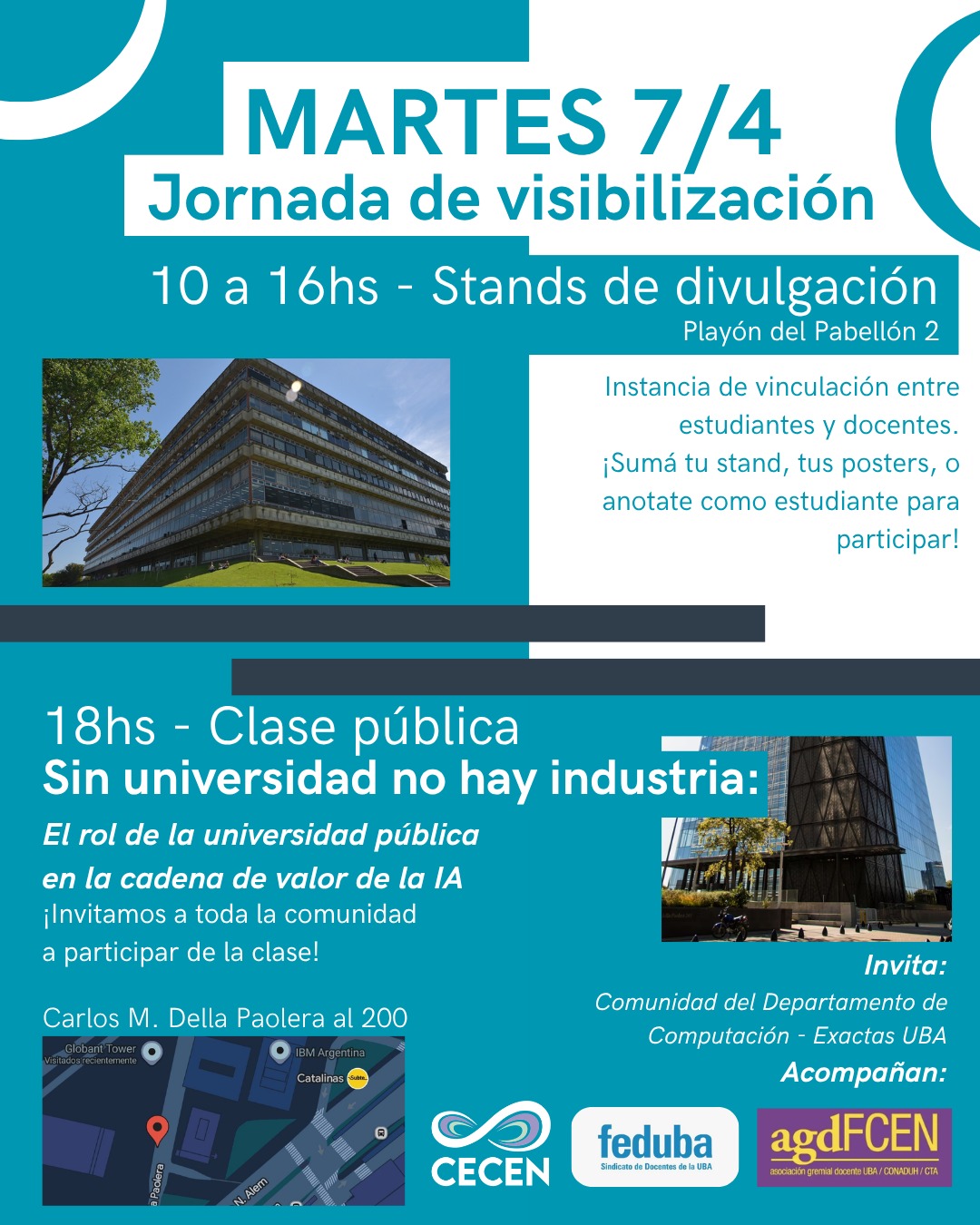 18 hs. Clase pública: «Sin universidad no hay industria. El rol de la universidad pública en la cadena de valor de la IA». Ubicación: Carlos Della Paolera al 200, torres Catalinas (Retiro).